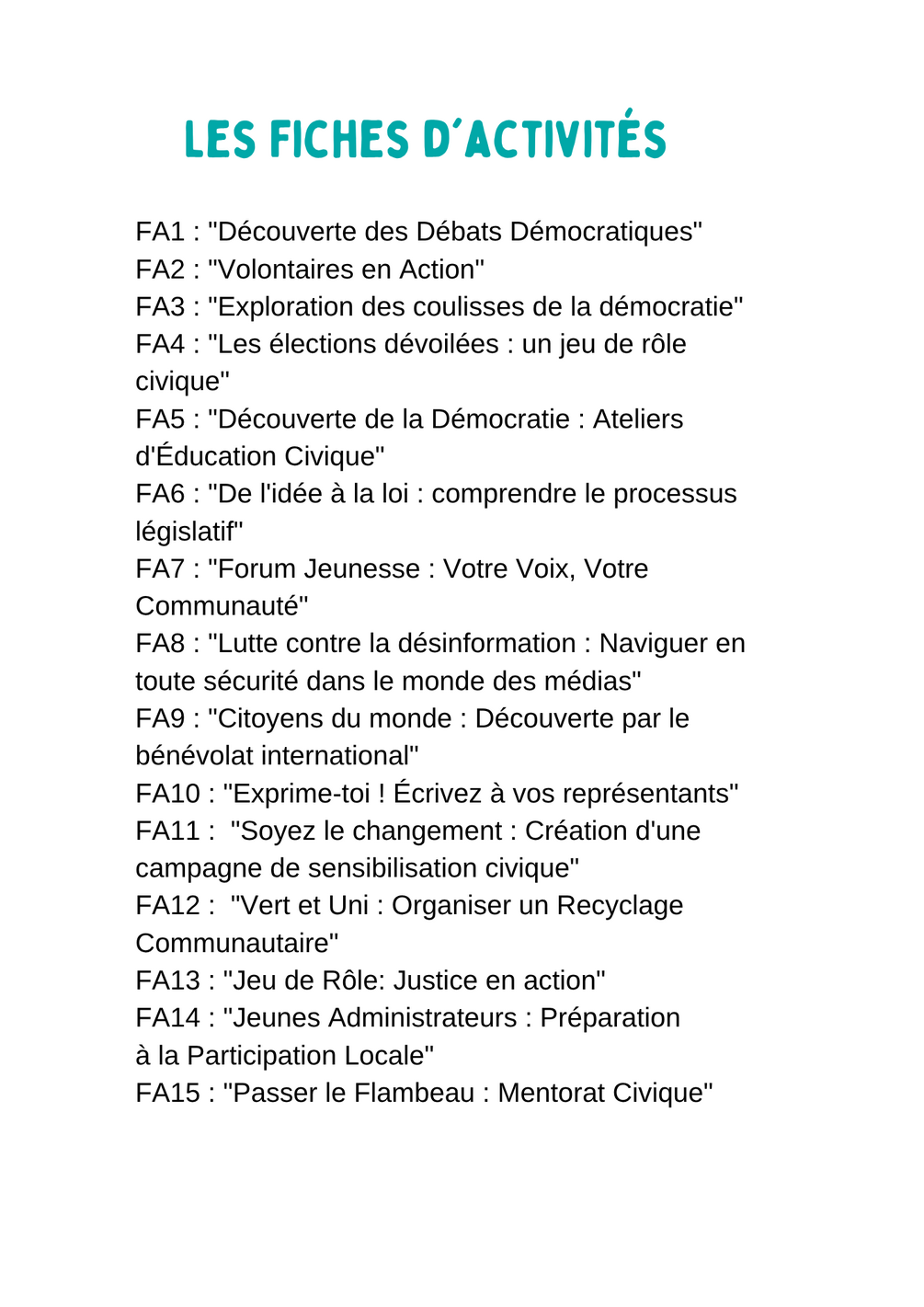 "ANIMER 15 Activités pour Animer la Citoyenneté et la Vie Civique" est une ressource complète conçue pour les animateurs désireux de proposer des activités significatives et de qualité axées sur les sujets de la citoyenneté et de la vie civique.
