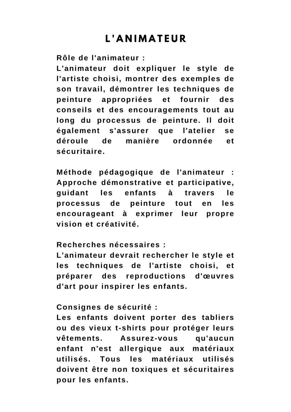 Cette ressource "ANIMER 15 Activités pour Animer une visite dans un musée d'Art" de la collection "ANIMER" de Jobanim présente 15 fiches activités passionnantes pour préparer et enrichir une visite dans un musée d'Art. Destiné aux animateurs, éducateurs, enseignants et parents, ce guide propose une variété d'activités adaptées à différentes tranches d'âge, des plus jeunes aux adolescents.